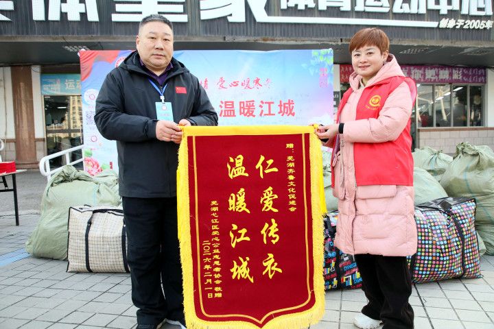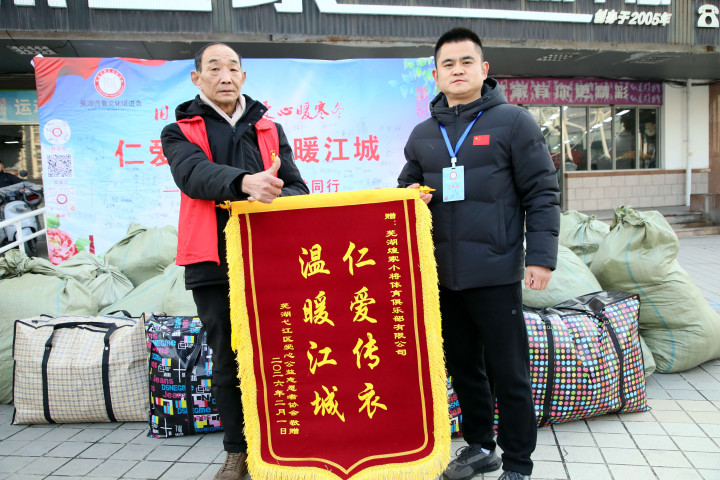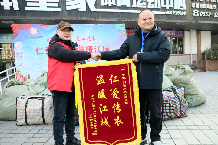 2月1日的集中捐赠仪式上,一场温馨的锦旗赠送环节,为本次公益活动增添了浓浓的温情。芜湖市弋江区爱心公益志愿者协会代表,向芜湖齐鲁文化促进会、芜湖煌家小将体育俱乐部有限公司、安徽人励通科技有限公司赠送了鲜红的感谢锦旗,一面面锦旗不仅是对爱心单位无私奉献的高度认可,更是对“仁爱传衣·温暖江城”公益行动的充分肯定,见证着爱心传递的力量与担当。